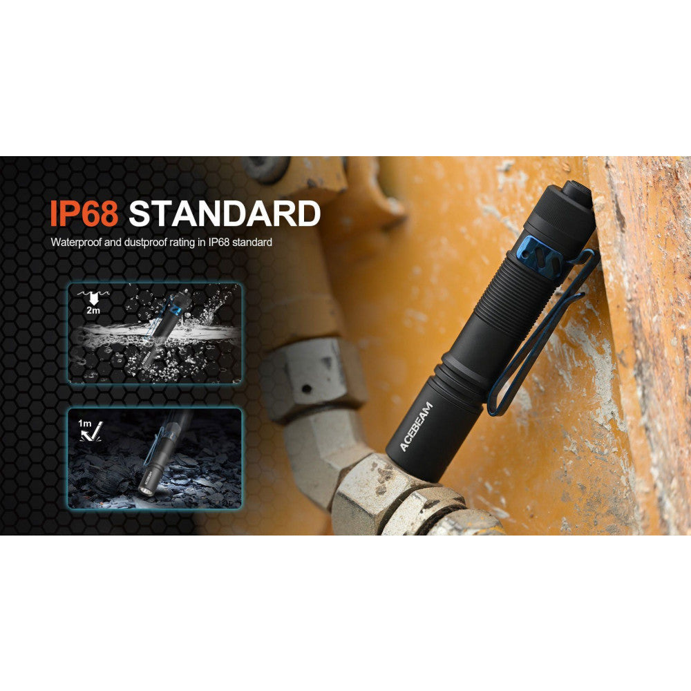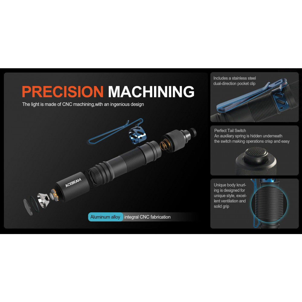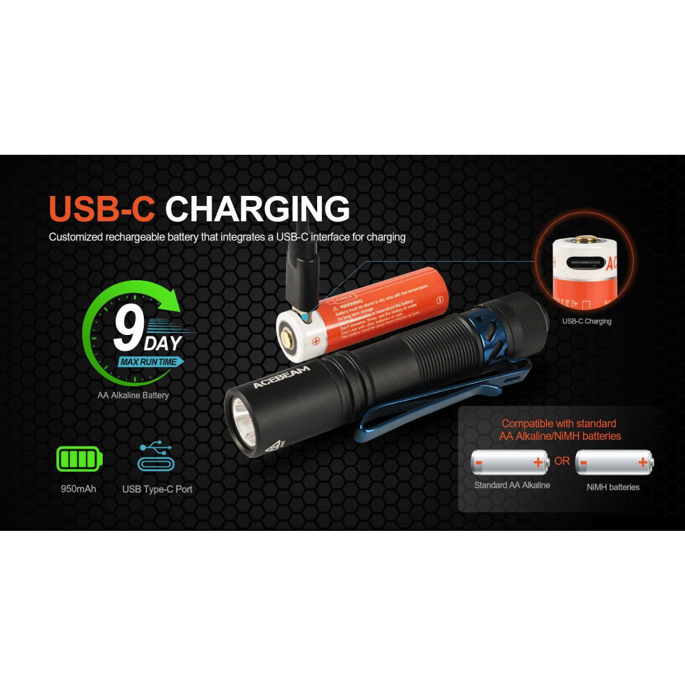 - Powered by one piece customised AceBeam 14500 rechargeable Li-ion battery with a built-in USB-C charging port.