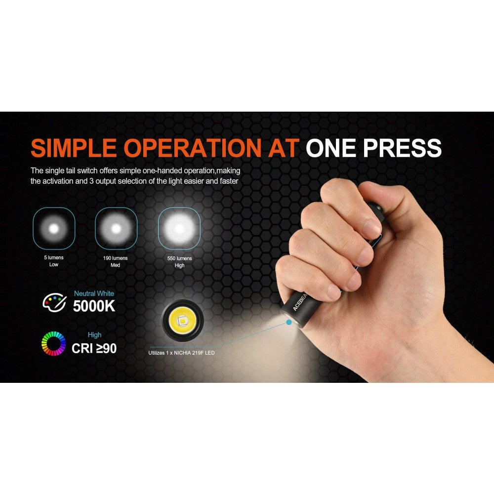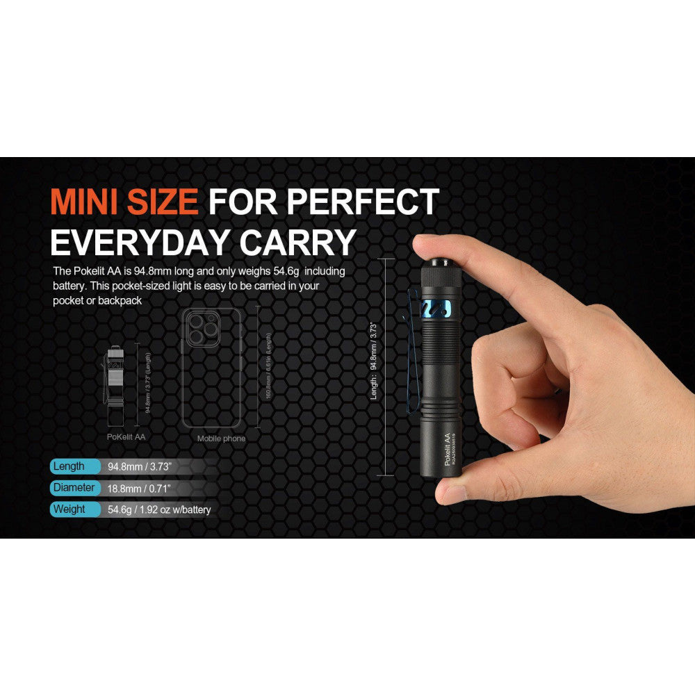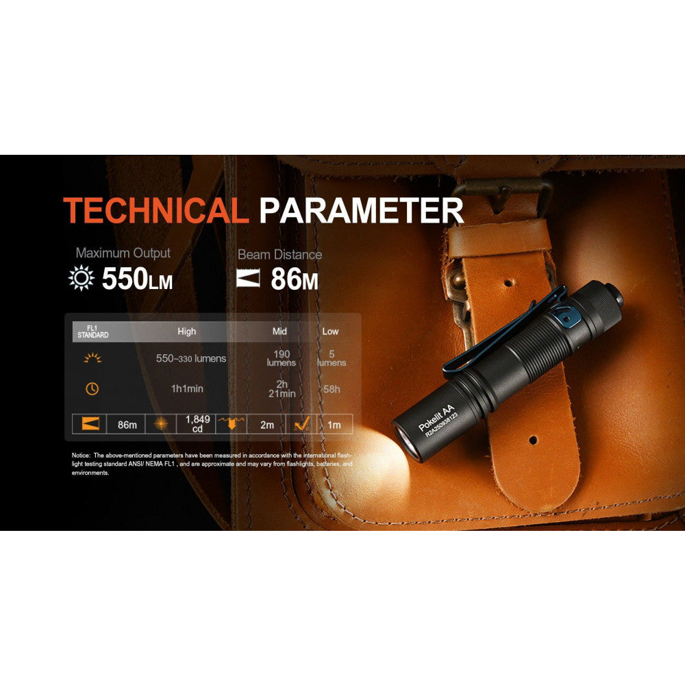 Acebeam Pokelit AA is a single AA/14500 pocket size lightweight flashlight, which is simple to use with the single tail switch, and exceptionally bright with 550 lumen output. With equipped high CRI≥90 LED, the light source can reproduce colours more accurately, delivering a peak beam distance of 86 metres. It is powered by a customised rechargeable 14500 battery that integrates a USB-C interface for charging, and it is also compatible with alkaline or NiMH AA batteries.