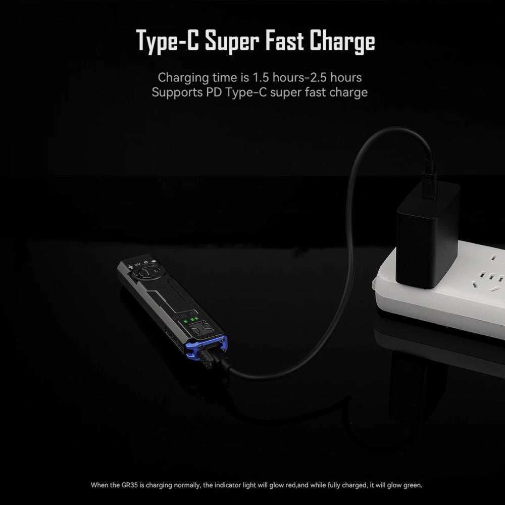 The compact 4-in1 light-source GR35 flat flashlight from Imalent, is fast Type-C rechargeable, and weighs just 108g. It utilises 2x latest long range LED which produce an impressive 2800 lumen, 426-metre beam. It features 6 brightness modes, plus strobe. Additionally, it offers a 365nm 630mW UV LED, a 650nm red laser light, and also a red and blue ‘police’ flashing mode. It is powered by a built-in rechargeable battery, which can provide over 33hrs hours of runtime in moonlight mode.