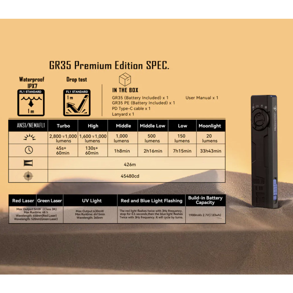 Imalent GR35 2800 Lumen Rechargeable Flat Flashlight with Red Laser/UV/Police Lights - 426 Metres