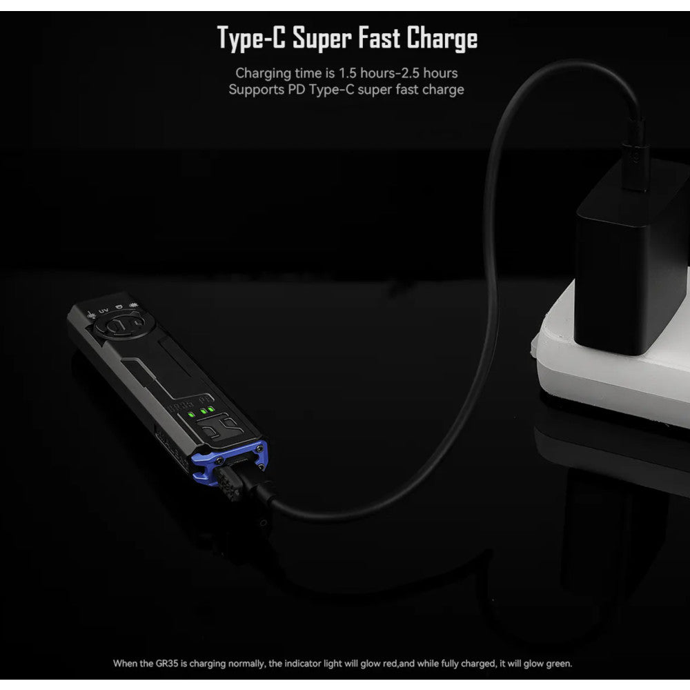 The compact 4-in1 light-source GR35 flat flashlight from Imalent, is fast Type-C rechargeable, and weighs just 108g. It utilises 2x latest long range LED which produce an impressive 2800 lumen, 426-metre beam. It features 6 brightness modes, plus strobe. Additionally, it offers a 365nm, 630mW UV LED, a 520nm green laser light, and also a red and blue ‘police’ flashing mode. It is powered by a built-in rechargeable battery, which can provide over 33hrs hours of runtime in moonlight mode. The Imalent GR35 PE is equipped with a 7000mAh wireless charging case, which can function as a power bank.