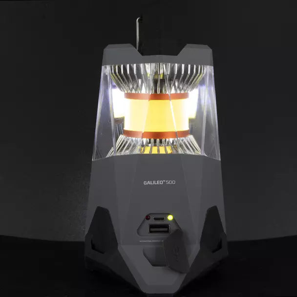 The Galileo™ 500 lantern by NEBO is a rechargeable, 500 lumen lantern with multiple beam patterns, dimming, direct-to-red, Smart Power Control, and carabiner-style carry handle. Featuring a USB output connector for powering or charging most USB devices and a carabiner-style handle. Dimensions: (L) 18.54 cm X (W) 10.67 cm X (H) 11.43 cm. Weight: 0.23 kg