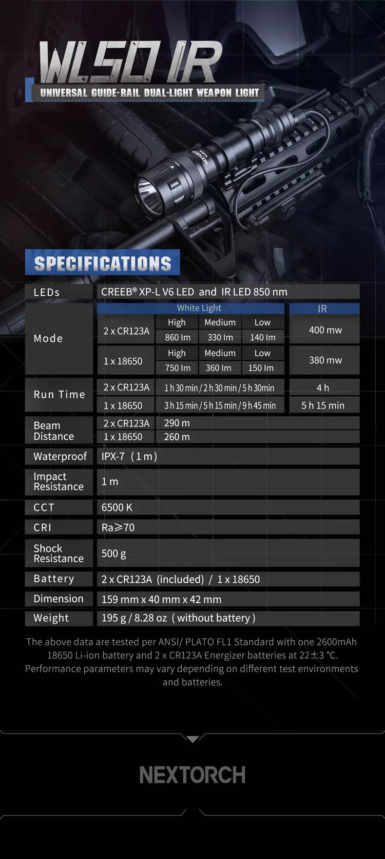 WL50IR is designed for low-light tactical lighting. It features 3 brightness modes (high, medium & low), a max output of 860 lumens, a strobe mode to temporarily blind your opponents, a patented dual-light structure, a rotational head switch for white light and infrared light, and an independent tactical remote switch designed for launching momentary on and constant light mode quickly. Wl50IR is compatible with one 18650 rechargeable Li-ion battery (included) and 2 x CR123A batteries(included), and able to meet the needs in different tactical environments. The main body is made of aerospace-grade aluminium alloy, Type III hard-anodised, IPX7 water-resistant, and stable & reliable. It can also be attached to all standard Picatinny rails.