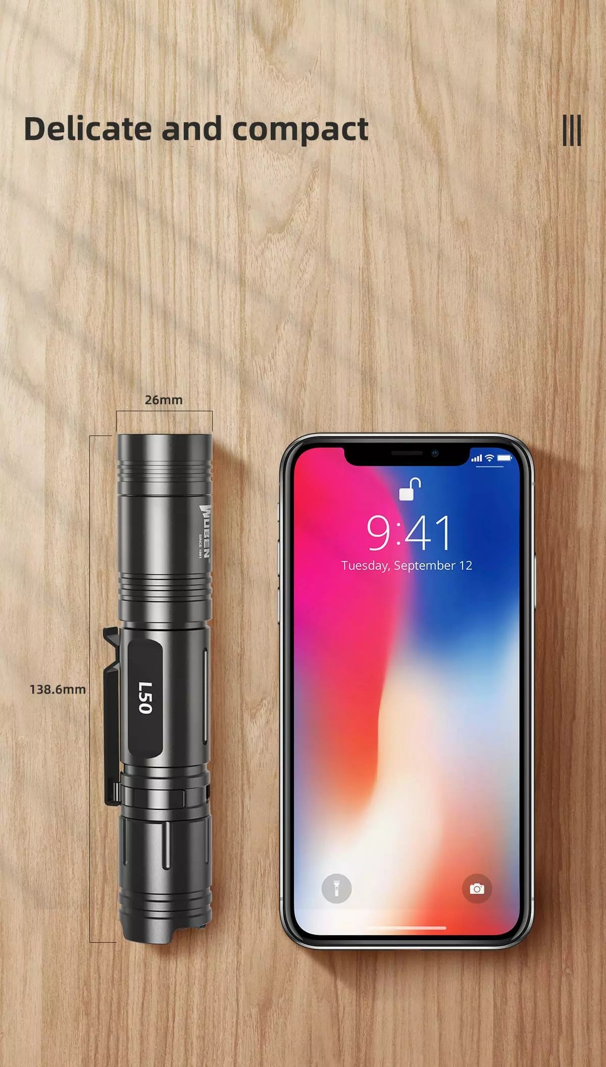 L50 is a versatile flashlight especially designed for outdoor activities. It’s so powerful but small and portable to carry. L50 utilises 1× OSRAM P9 LED, powered by 1x 18650 Li-ion battery (included), and emits 1200 lumens max output. Built-in charging design makes it more convenient to use.