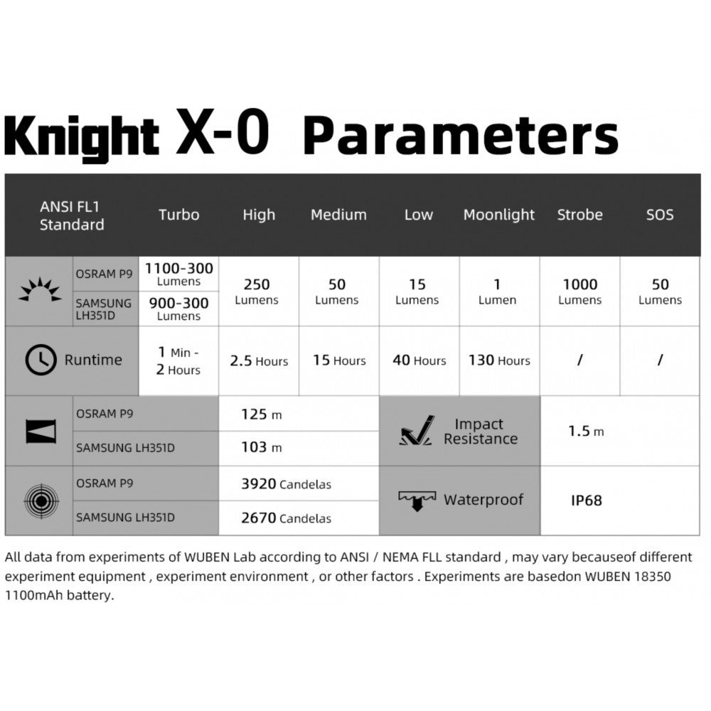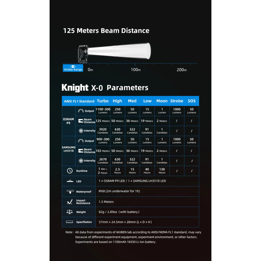 The Wuben X0 Knight high-CRI is extremely compact, measuring 2.24 x 0.96 x 1.10 inches and weighing just 82g. The high-CRI Samsung LH351D LED with the super flood lens offers the maximum output of 900 lumens and 103m beam distance with a 175º beam angle.. X0 comes with 5 common lighting modes: Moonlight, Low, Medium, High, Maximum and 2 flashing modes: Strobe and SOS.