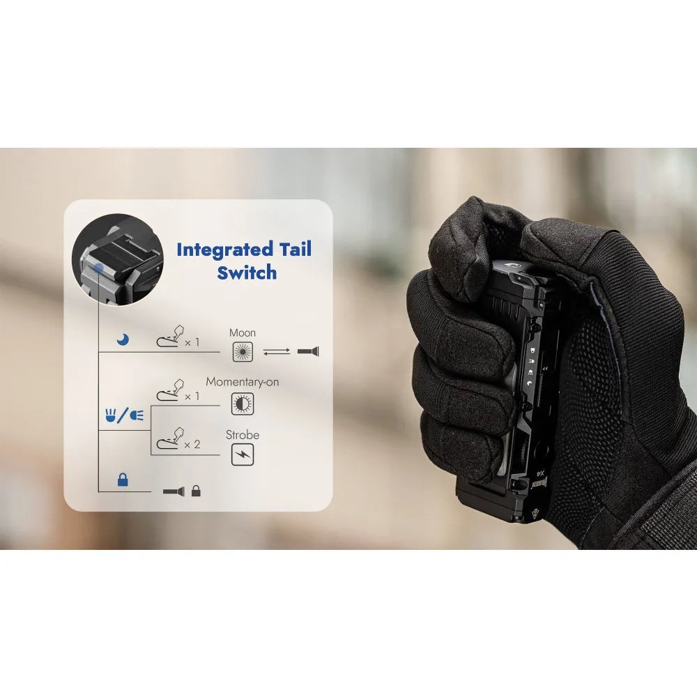 Designed with intuitive controls, the X4 features a tactical tail switch for instant turbo, strobe, or moonlight access; a side slider to select the main, side, or lockout mode; and a rotary dial used to smoothly scroll brightness or switch RGB colours. Despite packing rich functionality, it weighs only about 136–137 g (with battery) and measures roughly 96 × 37 × 26 mm, making it remarkably pocket-friendly for a high-output EDC light.